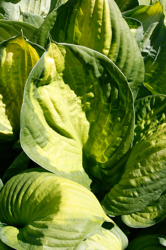 A medium sized variety great for shaded beds, borders and containers; features mounds of heart-shaped foliage with heavy texturing emerging chartreuse and turning to gold with wide green margins; pale lavender flowers appear in mid summer
